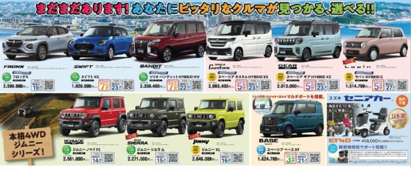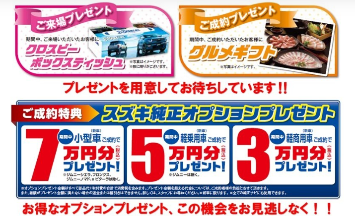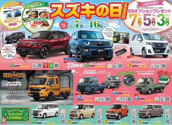 3月7日(土)~3月16日(月)の期間、CAR牧場全店で「スズキの日」を開催いたします。ご商談、ご成約の特典他、期間中はお買い得な条件を多数用意しております。皆様のご来場をスタッフ一同お待ちしております。