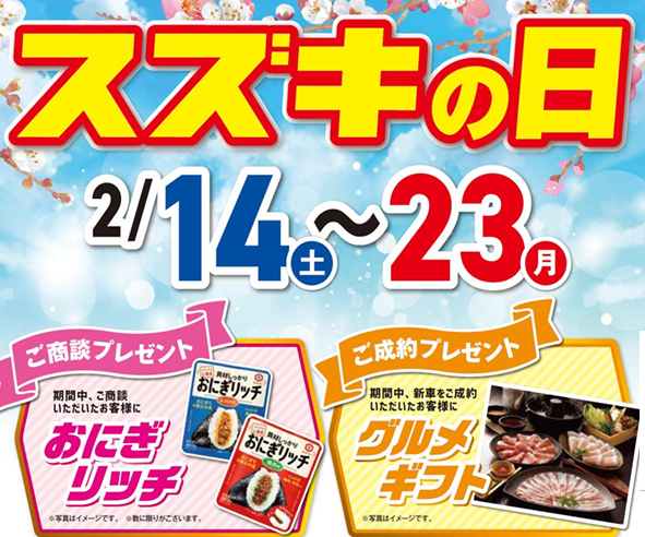 2月14日(土)~2月23日(月)の期間、CAR牧場全店で「スズキの日」を開催いたします。ご商談、ご成約の特典他、期間中はお買い得な条件を多数用意しております。皆様のご来場をスタッフ一同お待ちしております。