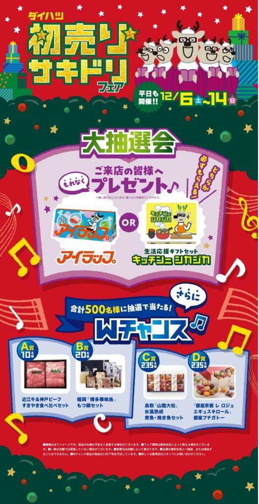 ダイハツ「初売りサキドリフェア」開催! 新着情報 イベント 12月6日~12月14日の期間、「ダイハツ初売りサキドリフェア!」を開催いたします。 期間中ご来場いただいたお客様にもれなくアイラップまたはキッチンニシカジカをプレゼント! 期間中査定、見積りをされたお客様にはどこでも吊り下げ収納ポーチをプレゼント! CAR牧場ならではのお買い得車も多数用意しております。ぜひご来店ください。 スズキ「先行初売りフェア」開催! 前の記事