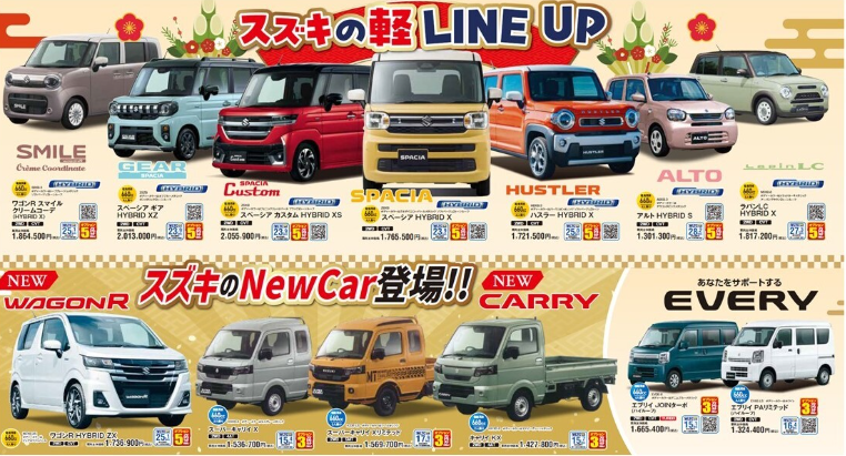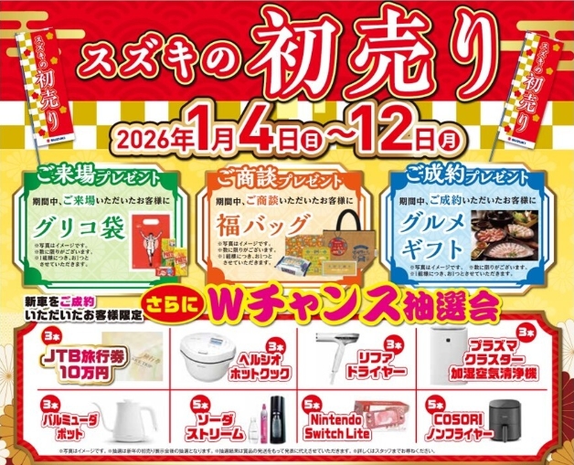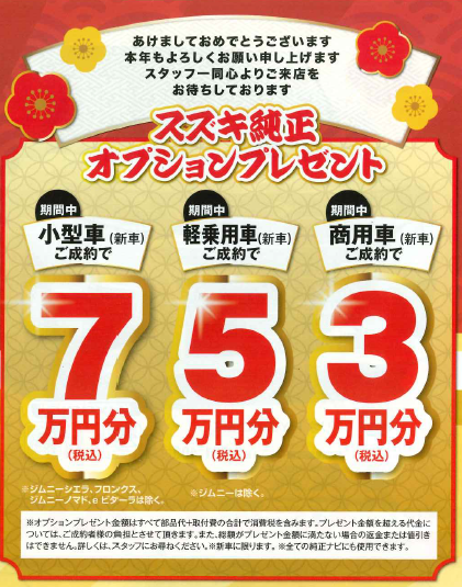 新春初売り1月4日 10:00AMスタート! 新着情報 イベント 1月4日(日)~1月12日(月)の期間、CAR牧場全店で「スズキの初売り」大商談会を開催いたします。ご商談、ご成約の特典他、期間中はお買い得な条件を多数用意しております。皆様のご来場をスタッフ一同お待ちしております。 ダイハツ「大初夢フェア」 前の記事 2月の営業カレンダー 次の記事